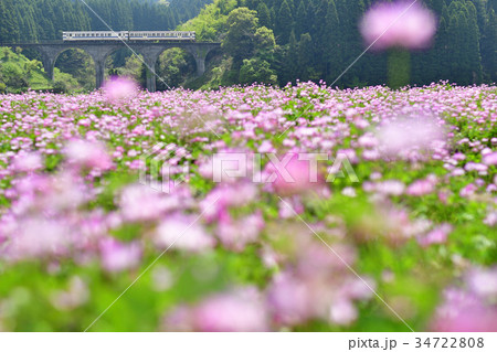 レンゲ畑と眼鏡橋を渡る列車