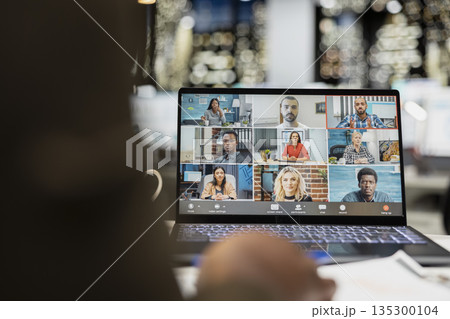 Professional team engaging in a business meeting on web video call, discussing with associates about a new partnership to help expand the company globally. Online conferencing chat.