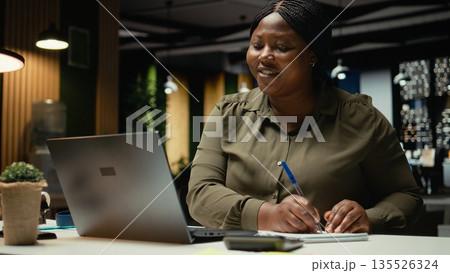 Entrepreneur communicates sales activity numbers to the investors on videocall, creating an analysis to obtain more funds. Business owner making a presentation pitch for development plans. Camera B.
