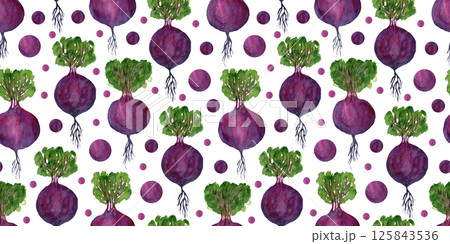 Cute harvest watercolor hand painted seamless pattern with purple beet root and green leaves. Bright painting print of magenta beetroot vegetables for kitchen textile design, wrapping paper, package