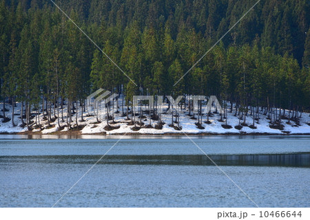 冬晴れの信州、深い雪に覆われた山林の木々の根元にできた根回りの雪解けが春の近さを告げている
