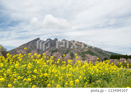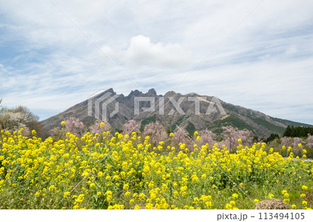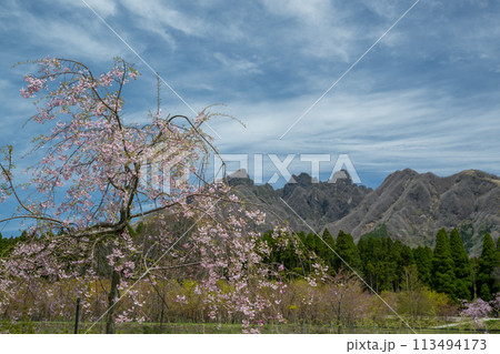 阿蘇高森から見える根子岳と春に咲く桜が美しい