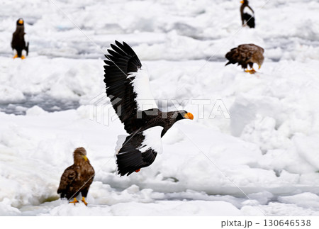 北海道羅臼町の沖合の流氷の上を飛ぶオオワシ