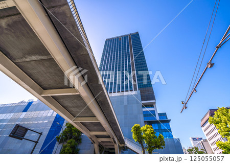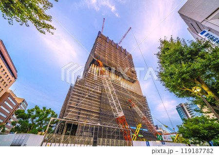 日本の横浜都市景観 関内駅前。横浜市旧市庁舎街区活用事業新築等工事などを望む。右にJR関内駅=18日