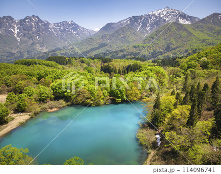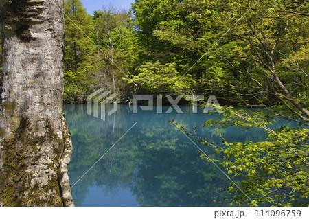 しろ池の美しい水面と新緑 新潟県糸魚川市