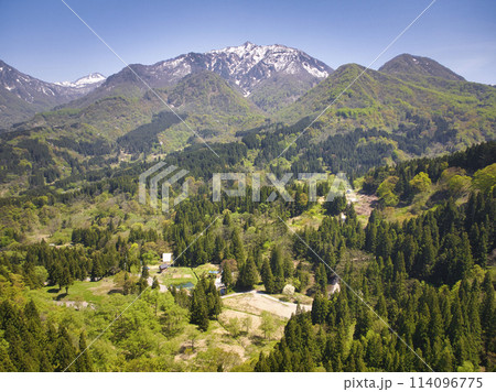しろ池からの根知谷の眺め 新潟県糸魚川市(ドローンによる空撮)