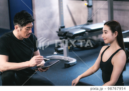 ジムでカウセリングをしているパーソナルトレーナーと女性