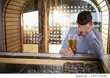Man wearing checkered shirt leaning on metal mesh bar counter holding pint glass, copy space
