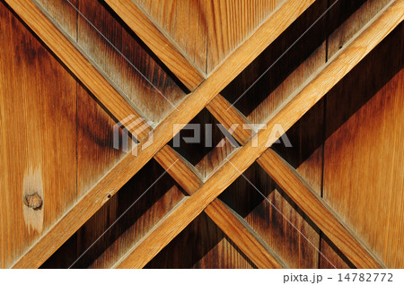 重厚な木造建築の柱と格子構造のディテール(暗所)