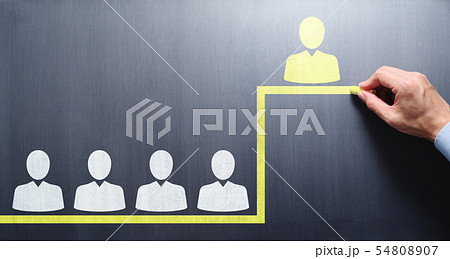 リーダーへのステップアップとその格差のイメージ。黒板に人のアイコンと段差を描く男性の手。
