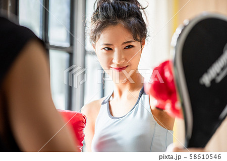 ジムでボクササイズ運動するかっこいい女性 ファイティングポーズ