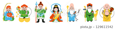 横一列に並んだ七福神のシンプルなイラスト(カラフル)