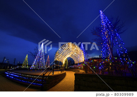 新幹線と在来線が同じ高さで見える桑折駅のイルミネーション