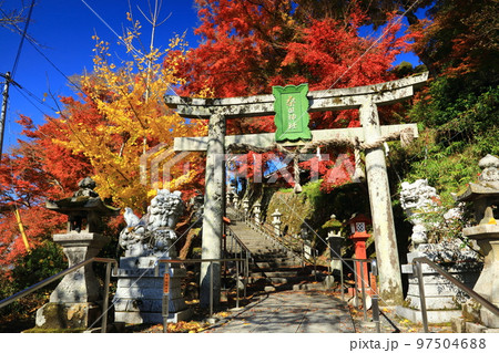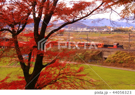 桑田神社(京都府亀岡市)境内の紅葉から見るトロッコ列車