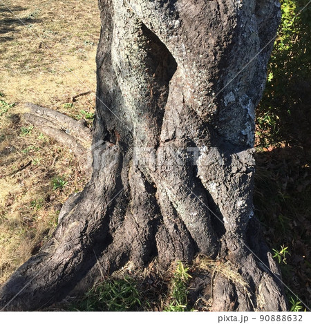大島桜の木、白い桜の木の根っこ、桜の木の根元、オオシマザクラの幹、白い花の咲く木の幹と根