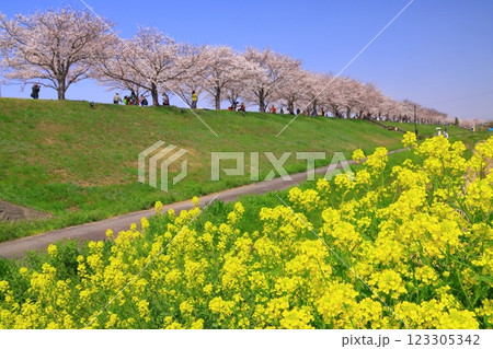 小野桜つづみ廻廊(兵庫県小野市)に咲く満開の桜と菜の花