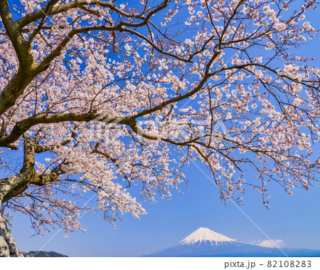 (静岡県)桜満開の富士市雁堤(かりがねづつみ)から望む富士山