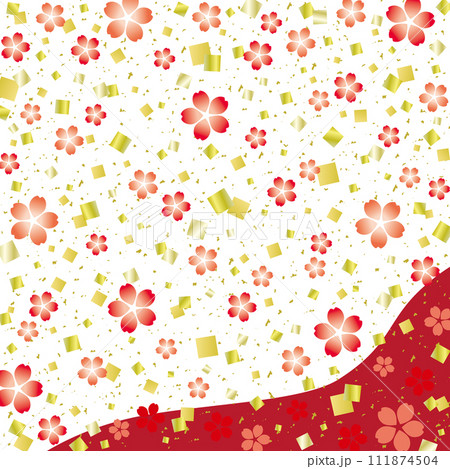 桜の花と金箔紙吹雪の和風背景/正方形/赤・金