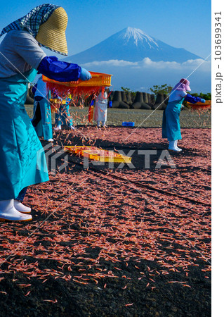 春の風物詩干し桜海老の作業と富士山