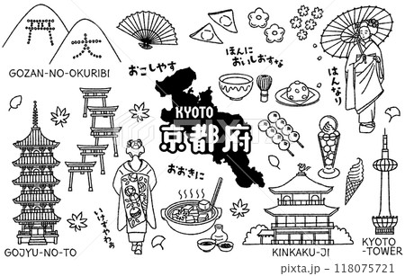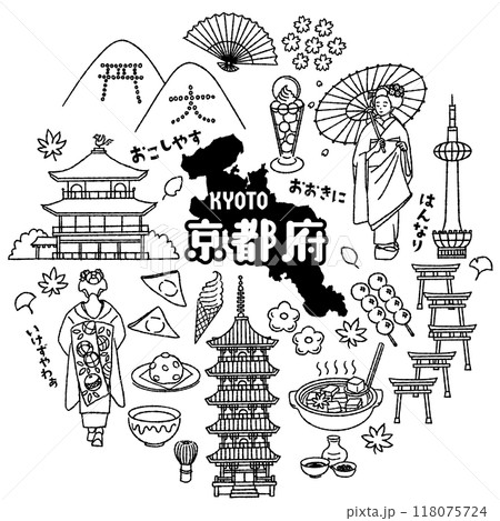 シンプルでかわいい京都府にまつわるイラストセット(モノクロ)