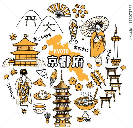 シンプルでかわいい京都府にまつわるイラストセット(2色)