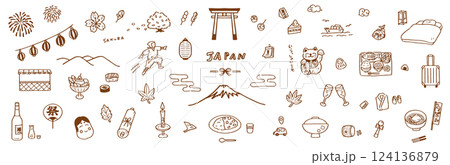 日本文化や観光の手書きベクターイラストアイコンセット。日本の食事や自然。日本旅行のイメージ。
