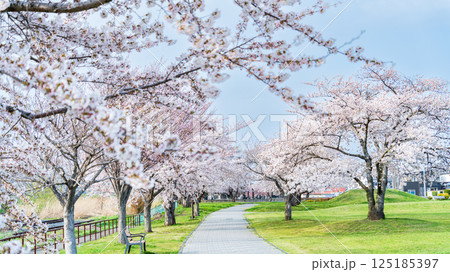 春の桜並木 満開の観音寺川の桜 福島県猪苗代町