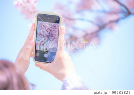 桜をスマホで撮影する女性