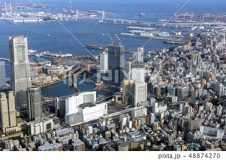 日本の横浜都市景観 横浜港などを望む(右下に桜木町駅)