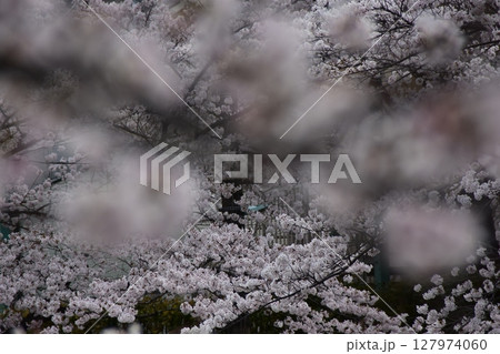 夕暮れの川辺で満開に咲く美しいソメイヨシノ(桜)。神奈川県-2024年撮影。