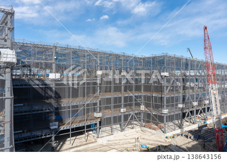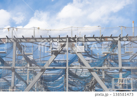 鉄骨建方工事中の仮設足場のある現場