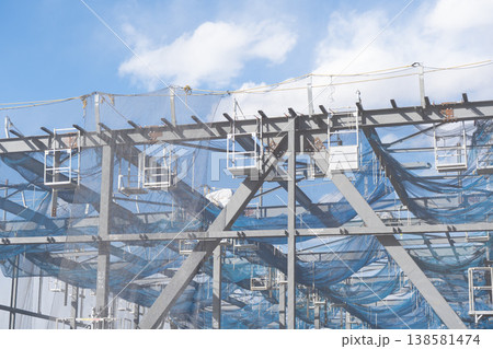 鉄骨建設現場で高所作業と安全ネット設置を行う作業員 物流施設新築工事1