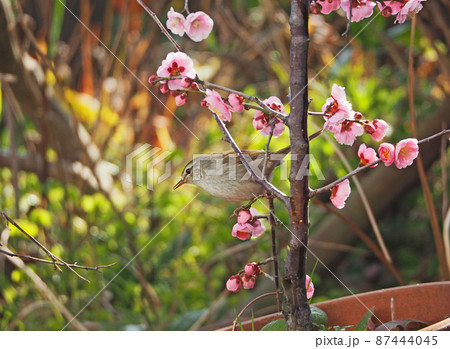 ピンクの梅の木にとまる日本三鳴鳥のウグイス