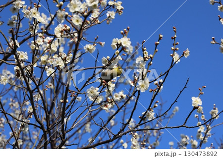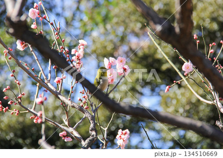 梅の花にとまるメジロ 旧芝離宮恩賜庭園の日本庭園で見られる早春の野鳥風景