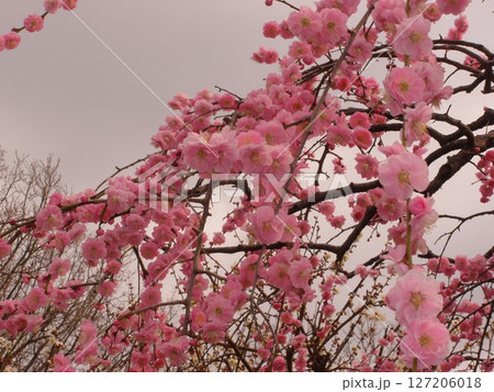 青空を背景にピンク色の枝垂れ梅が咲いています