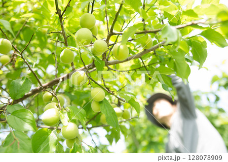 梅の実をもぎ取る