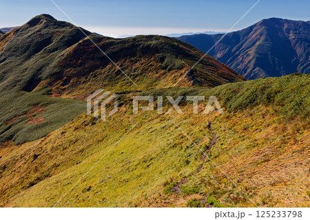 飯豊連峰・主稜線縦走路の草紅葉と烏帽子岳・北股岳