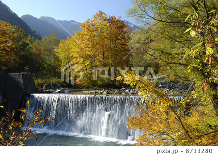 山形県小国町 温身平の川の堰と黄色く紅葉した木々