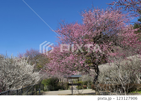 静岡県熱海市 熱海梅園 香浮橋(こうふばし)から頂上韓国庭園方面の梅林 早咲きの梅
