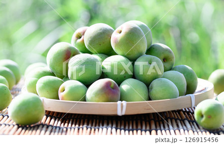 瑞々しい青梅と竹籠の静物写真|初夏の和素材