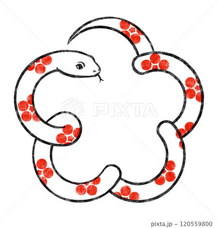 赤い梅鉢文様が入った白いヘビで梅の花の形 版画風