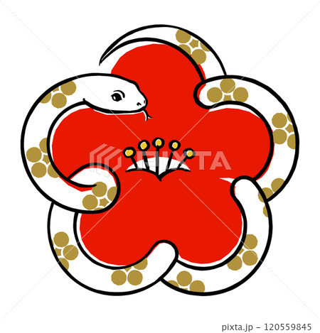 赤い梅鉢文様が入った金色の輪郭線の白いヘビで梅の花の形 版画風