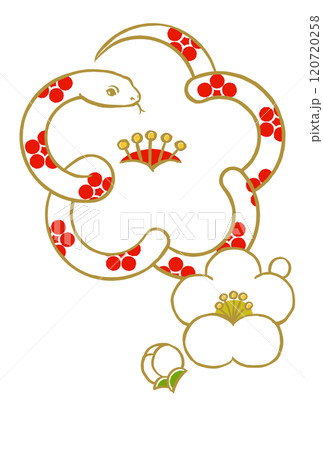 金色の梅鉢文様が入った白いヘビで梅の花の形 版画風