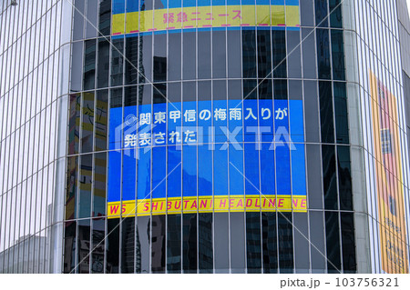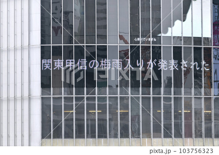 日本の東京都市景観 梅雨入りを伝える速報。きょう5類移行から1か月…(渋谷はマ無しの方増)=8日、夕