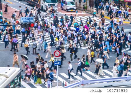 日本の東京都市景観 梅雨の渋谷は傘の華…マ無しの方が多い。電車の中でもマ無しの方が増加…=6月12日