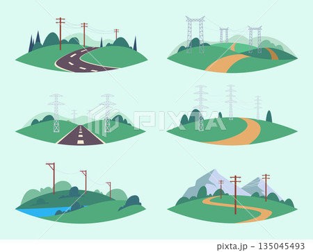 High voltage towers. Urban energy infrastructure towers of electricity outdoor valley exact vector cartoon set