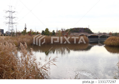 秋のイイナパーク川口より望む川口市めぐりの森(火葬場)