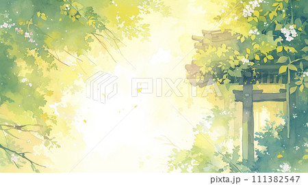 赤い鳥居のある日本の神社の水彩画 AI画像