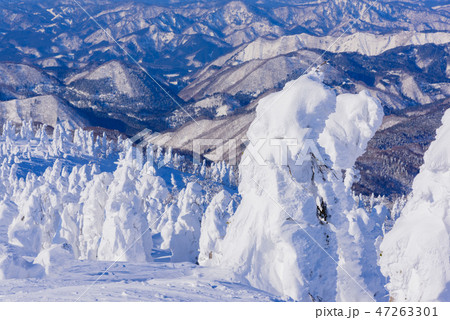 遠く秋田駒ヶ岳が望める快晴の森吉山樹氷群 秋田県