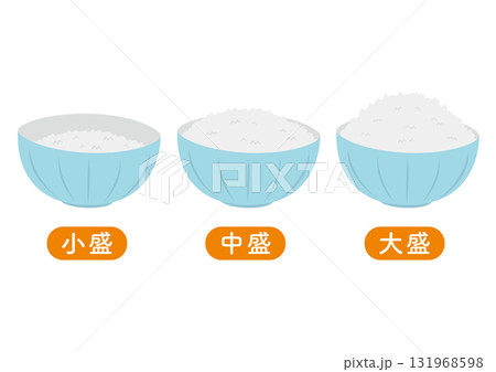 青い茶碗に盛られた色々なサイズの白米のイラストのセット